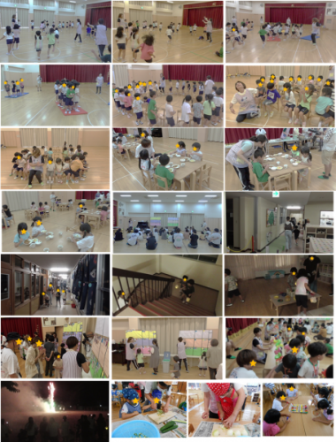 5歳児さんのサマーフェスティバルがありました。午前中にプラバンの下絵を描いて、午後からは夕食のカレーやサラダのお手伝いのクッキング!!今日まで何回か練習して来たので「もう1人で切れるよ!」と言いながら、上手に包丁やピーラーを使う子ども達の表情はとってもたくましく見えました(*^-^*)夕方までドッチボール等のゲーム遊びを遊戯室で楽しみ、そのまま夕食をみんなで食べた後は保護者の方が登場(*^▽^*)子ども達のワクワクも最高潮!!手作りのランタンを持って親子で夜の保育室を回り、先生達が事前に隠したポケモンのキャラクター探しに大盛り上がりし、初めての夜の保育園にハイテンションの子ども達でした。最後は花火鑑賞をして、楽しい1日を終えました。「楽しかった(≧▽≦)」という声がたくさん聞けて、先生達も嬉しかったよ!!ご協力頂いた役員の皆様、ありがとうございました。