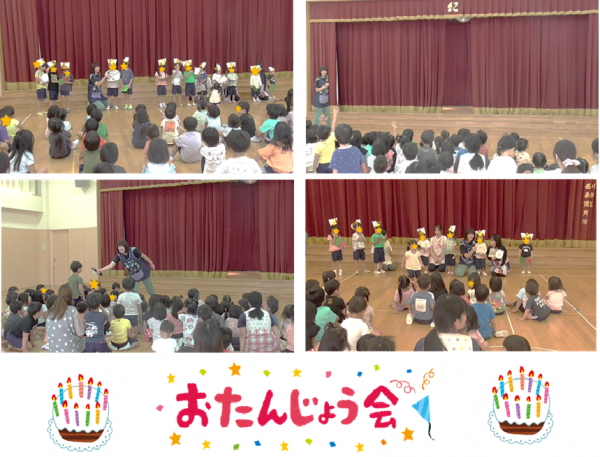 今月は14名のお友だちが誕生日を迎え、今日は誕生会でみなんにお祝いをしてもらいました。自己紹介やお歌を歌った後、先生からのお祝いは「何が通ったかな?ゲーム」でした。舞台の幕のすき間を色々な物が通り抜けて行くのですが…早い!!「え?今の何やった?」とみんな大盛り上がり(≧▽≦)楽しい時間をみなんで過ごしました。9月生まれのお友だちのみんなが、毎日元気に笑顔で過ごせますように(*^-^*)