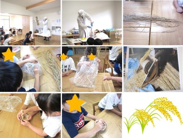 今日は先月から干していた稲の″脱穀(だっこく)”と″籾(もみ)すり”を行いました。