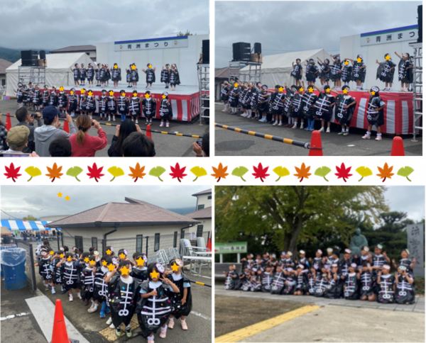 10月26日(日)に開催された、青洲まつりに5歳児さんが参加して来ました。自分達で手作りをしたハロウィンパーティー用のマントと頭飾りをつけて「グーチョキパーでパンプキン」の踊りを披露しました。会場からは「可愛い」という歓声が上がり、子ども達も楽しそうに笑顔で踊ることが出来ていました。ご協力頂きました保護者の皆様、関係者の皆様ありがとうございました。
