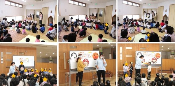 誕生児も参加し、「うえ!した!」と歓声が上がり盛り上がりました!乳児部では、保育士と一緒に誕生児をお祝いし″ばけばけばけたくん”のペープサートを楽しみました。