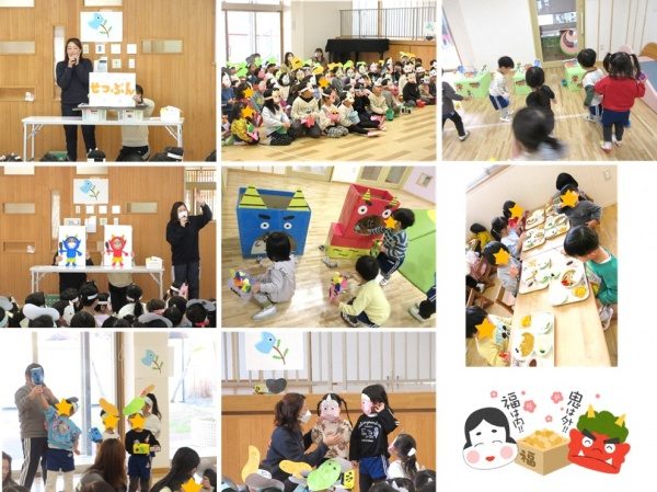 みんなでホールに集合し、手作りのお面を見せ合ったり、節分のお話を聞いて楽しみました。