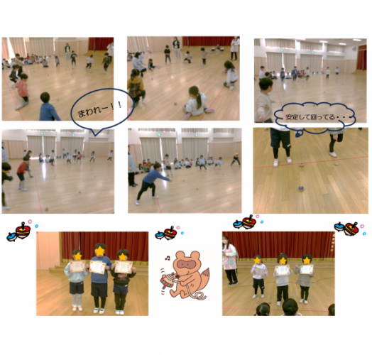 感染症や雪などの影響で延期になっていたこま回し大会を、本日ついに行うことができました。時間があれば友だちと回す練習をする姿が見られたり、家でも練習をしていることを保護者の方から聞いたり…今日は思うように回せた子、思うように回らなかった子、喜んだ子、悔しい思いをした子、色々な子ども達がいましたが、どの子もみんな「こま回し名人」に認定です(*^-^*)
