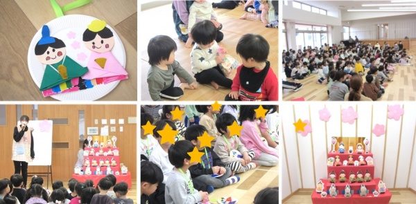 全年次が遊戯ホールに集合し、クラスで制作したおひな様を見せ合いっこしました。