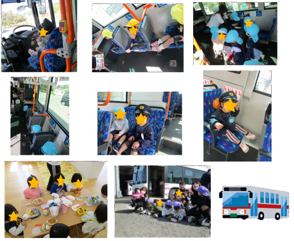 今日は名手にある和歌山バス営業所まで0,1,2歳児一緒に遠足に行ってきました。しっかり歩くことが出来ました。和歌山バスさんのご厚意でバスの中の見学をさせてもらったり、座席や、運転席に座らせてもらったりして楽しませてもらいました。運転手さんの帽子もかぶらせてもらい子どもたちは大喜びしていました。かっこいい姿に大変身していましたよ。朝早くからお弁当作りありがとうございました。