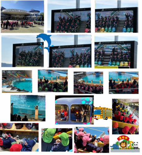 3、4、5歳児でアドベンチャーワールドへお別れ遠足に行って来ました。バスの中では「おにぎり楽しみ」「パンダおらんけどレッサーパンダはおるねん」「お腹空いたぁ(朝早かったもんね、、)早くおにぎり食べたい」など…会話も盛り上がり、途中から4、5歳児さん達の歌の合唱が自然に始まってアカペラのBGMに先生達の心も温かくなりました(*^-^*)観覧車が見えた瞬間にみんなのワクワク度が一気に上昇♪イルカショーでは正面の大画面に名手保育園のみんなが映ったり、可愛いイルカ達の演技を見る度に大歓声!昼食時間は、お互いに「何入ってんの?」と具を見せ合いっこする姿も見られ、両手に持って幸せそうに食べていました♡ケニア号では、色々な種類の動物達にくぎずけの子ども達でした。朝早い時間からのおにぎり作りと送迎のご協力ありがとうございました。