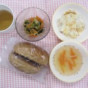黒糖ロールパン(3歳以上児)ロールパン(2歳児)食パン(1歳児)ポテトグラタンもやしのカレー風味和えコンソメスープ