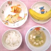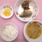 ごはん 鯖の甘辛ごま照焼 三色和風和え みそ汁 果物(パイン缶)