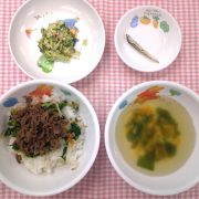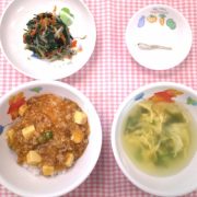 マーボー丼 ほうれん草ともやしのナムル 卵スープ 小魚