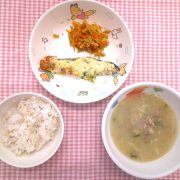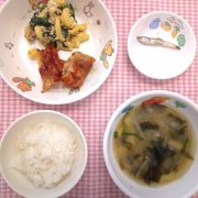 ごはん ヤンニョムチキン 和風マカロニサラダ みそ汁 小魚