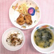 ☆誕生会☆ ふりかけごはん 鶏肉のから揚げ スパサラ みそ汁 ゼリー