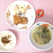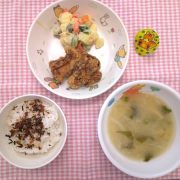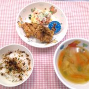 ☆誕生会☆ ふりかけごはん 鶏のから揚げ マセドアンサラダ みそ汁 ゼリー