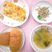 ロールパン マカロニグラタン 小松菜のツナ和え コンソメスープ 小魚