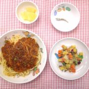 ミートスパゲティ さつまいもサラダ 果物(パイン缶) 小魚