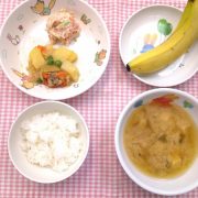 ごはん カレー肉じゃが 白菜とツナのサラダ みそ汁 果物(バナナ)
