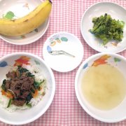ビビンバ風丼 ブロッコリーのナムル 春雨スープ 小魚 果物(バナナ)