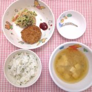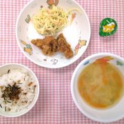 ☆誕生会☆ ふりかけごはん 鶏のから揚げ スパサラ みそ汁 ゼリー