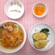 かやくうどん さつまいもの天ぷら 付₎ブロッコリー 果物(みかん缶) 小魚