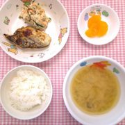 ごはん 鯖の甘辛ごま照焼 切り干し大根のサラダ みそ汁 果物(みかん缶)