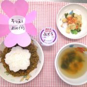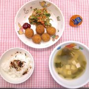 ☆誕生会☆ ふりかけごはん 里芋のコロコロチーズ揚げ ブロッコリーとハムのゴマサラダ みそ汁 ゼリー