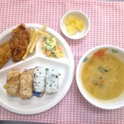 ☆おわかれ会☆ おにぎり(わかめ・ツナとにんじん) 鶏のから揚げ フライドポテト マカロニサラダ みそ汁 果物(パイン缶)