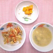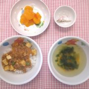 ☆自由保育☆ マーボー丼 小松菜の中華スープ 果物(みかん缶) 小魚
