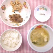 ☆自由保育☆ ビビンバ風丼 わかめスープ 果物(モモ缶) 小魚
