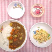 ハヤシライス マカロニサラダ 果物(パイン缶) 小魚