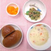 黒糖ロール クリームシチュー レタスと春雨の和風ツナサラダ 果物(みかん缶) 小魚