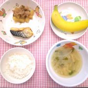 ごはん 鯖の塩焼き じゃがいもと豚肉の甘辛炒め みそ汁 果物(バナナ)