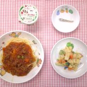 ミートスパゲティ ゆで野菜サラダ ヨーグルト 小魚