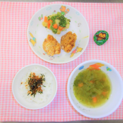 ふりかけごはん 鶏肉の唐揚げ ゆで野菜サラダ カレーコンソメスープ ゼリー