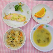 炊き込みご飯 鮭のねぎマヨ焼き 付(ブロッコリー) みそ汁 果物(オレンジ)