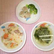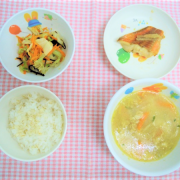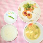 ごはん 里芋のコロコロチーズ揚げ ブロッコリーとハムのゴマサラダ 味噌汁 小魚 ※園で収穫したきゅうりをばら組に提供しています