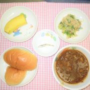 ロールパン ビーフシチュー 春雨とレタスの和風ツナサラダ 果物(バナナ) 小魚
