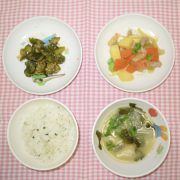 青菜ごはん カレー肉じゃが カリカリきゅうり 味噌汁 小魚