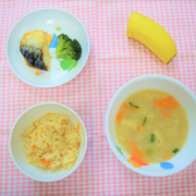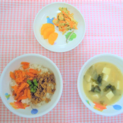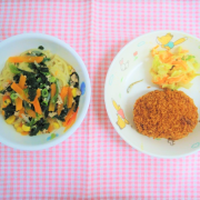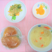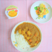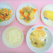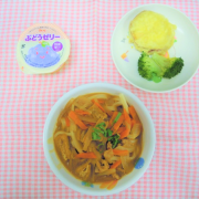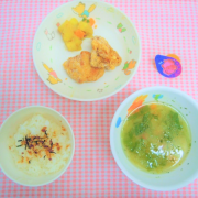 ふりかけごはん 鶏肉の唐揚げ さつまいもサラダ カレー風味の野菜スープ ゼリー