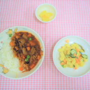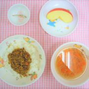 ☆自由保育☆ ドライカレー もやしスープ 果物(リンゴ) 小魚