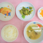 ごはん 鮭のチーズ焼き ブロッコリーのごまあえ みそ汁果物(ミカン缶)