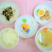 ごはん 鶏肉とゆで卵のさっぱり煮 小松菜の納豆あえ 味噌汁 果物(モモ缶)