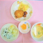 おにぎり(わかめ・コーンと枝豆) とんかつ ミートボール スパゲティサラダ 味噌汁 果物(ミカン缶)