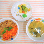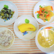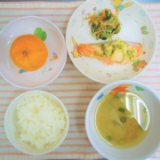 ごはん 鮭のねぎマヨ焼き チンゲン菜ともやしのナムル 味噌汁 ※みかん(ひまわり組の平野さんより戴いたのでお昼に提供しました) &n····