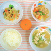 ごはん 豚肉じゃが 小松菜とキャベツのしらす和え 味噌汁 果物(ミカン)
