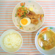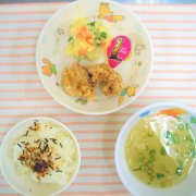 ☆誕生会☆ ふりかけごはん 鶏肉の唐揚げ マセドアンサラダ 春雨スープ ミニゼリー