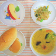 ロールパン かぼちゃシチュー 春雨とレタスの和風ツナサラダ 果物(リンゴ)