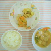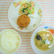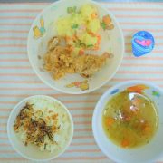 ☆誕生会☆ ふりかけごはん 鶏肉の唐揚げ マセドアンサラダ カレー風味の野菜スープ ミニゼリー
