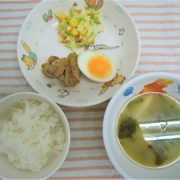 ごはん 鶏肉とゆで卵のさっぱり煮 キャベツとコーンのサラダ 味噌汁 小魚