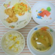 コーンご飯 鶏肉のレモン煮 キャベツとベーコンの炒め煮 味噌汁 すいか小魚 ※すいかをいただいたので、本日の給食で提供させて頂きました。