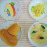 ロールパン クリームシチュー キャベツとコーンのサラダ 果物(リンゴ)