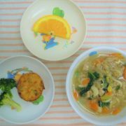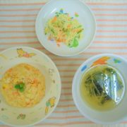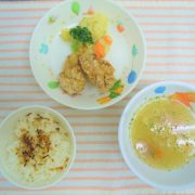 ☆誕生会☆ ふりかけごはん 鶏肉の唐揚げ ゆで野菜サラダ 野菜とソーセージのスープ チュルルン